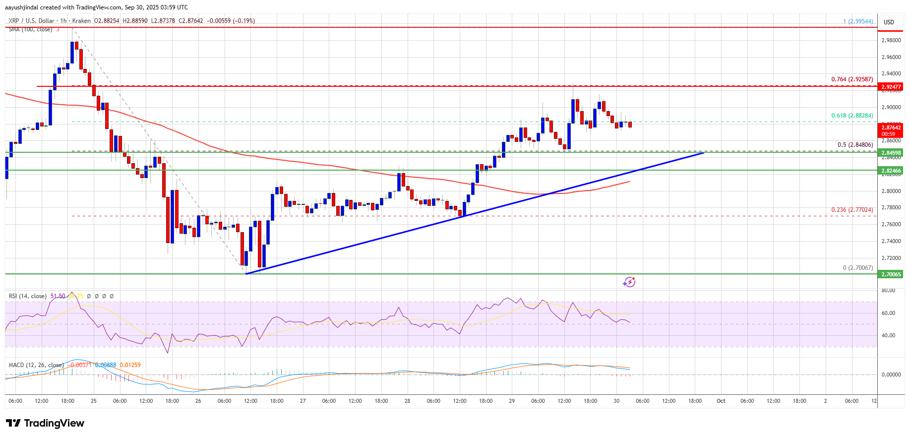 Hubo un movimiento claro por encima del nivel de retroceso de Fibonacci del 61.8% de la ola descendente desde el máximo de $2.995 hasta el mínimo de $2.70. Los alcistas incluso empujaron el precio hacia $2.920 antes de enfrentar resistencia. Además, se está formando una línea de tendencia alcista de conexión con soporte en $2.8320 en el gráfico horario del par XRP/USD.