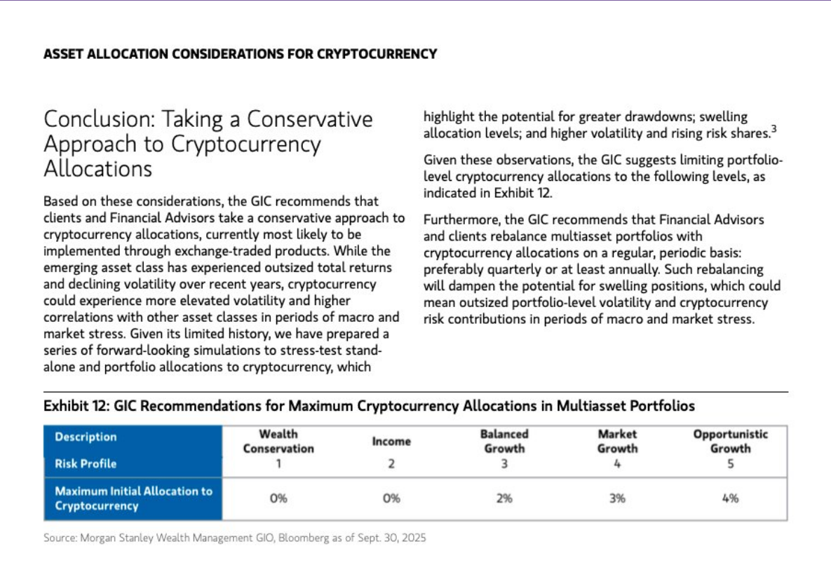 Según la unidad de gestión de patrimonio de Morgan Stanley, algunos clientes deberían mantener solo una pequeña porción de criptomonedas en sus carteras. La guía de la firma sugiere un enfoque cauteloso: hasta un 2% para carteras más medidas y hasta un 4% para aquellos que buscan un mayor crecimiento.