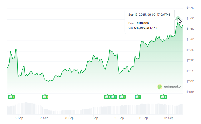 Bitcoin ha retrocedido por encima de la marca de los 116.000 dólares. Los informes muestran que BTC cotiza a 116.240 dólares, un movimiento diario del 0,25% y un 3% más en la última semana.