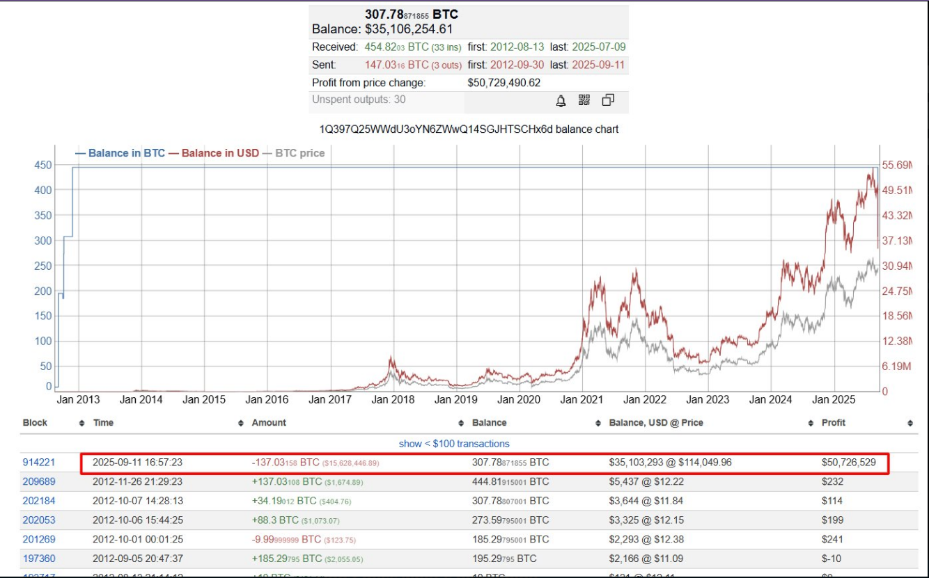 Según Onchain Lens, la dirección que recibió por primera vez monedas el 26 de noviembre de 2012, movió 132,03 BTC en una sola transacción.