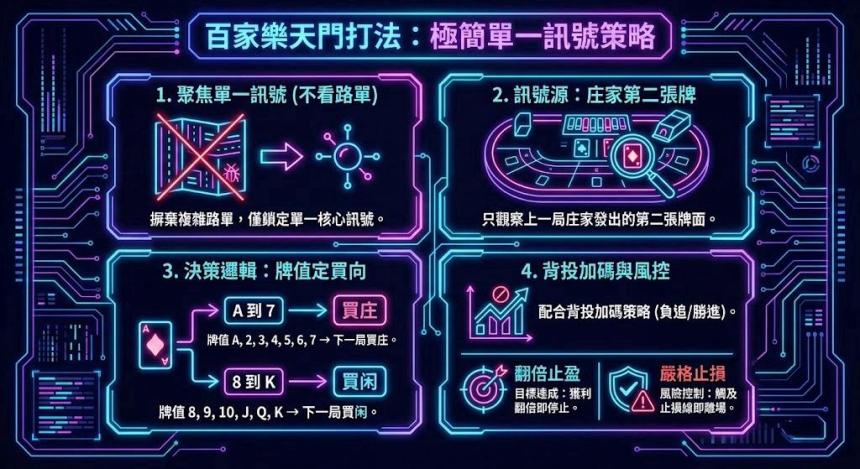 El método de "Tiān Mén" utiliza la segunda carta del banquero como la única señal, evitando completamente el gran camino, el pequeño camino y el camino de las cucarachas, y convierte el juego de Baccarat en una fórmula fija y una ejecución disciplinada, con una gestión de apuestas de progresión para amplificar las victorias a corto plazo y alcanzar el objetivo de duplicación. Es más racional considerar este método como un proceso para reducir la indecisión y la interferencia emocional, y la clave del éxito radica en la gestión estricta de Stop Win y Stop Loss, y en aceptar el riesgo de cola que conlleva la progresión de apuestas.