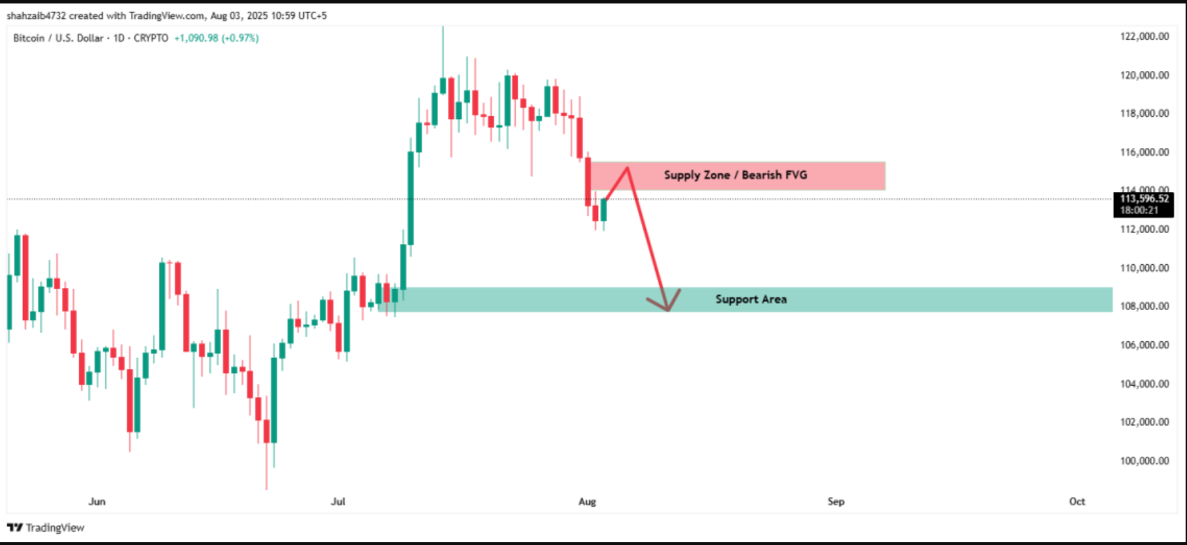 En un análisis, el experto en criptomonedas Kamran Asghar destacó cómo el retroceso de Bitcoin podría ser solo temporal y de corta duración, dado que ocurrió dentro de un Fair Value Gap (FVG) bajista. Esto ocurrió después de un pequeño rebote de $112,000 a alrededor de $115,000, con el FVG bajista ubicado entre $114,000 y $115,500. Esta brecha de valor se creó después de la caída del precio desde $118,000, lo que sugiere que Bitcoin está tratando de "llenarla" nuevamente.