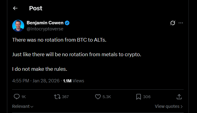 El 28 de enero, cuando el oro estaba negociando cerca de su máximo histórico de $5,597, un nivel que alcanzó el 29 de enero, Cowen publicó públicamente que no debía esperarse una rotación desde los metales hacia la criptomoneda.