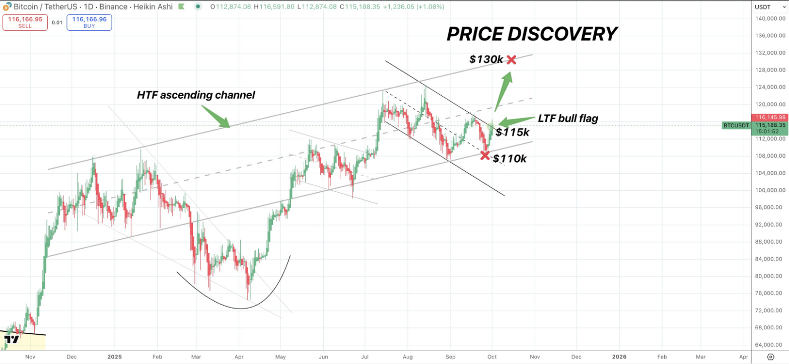 El analista Satoshi Flipper señaló que BTC parece haber construido una base por encima de la zona de 115.000 dólares y mantiene una estructura de marco temporal superior, y agregó que el objetivo de ruptura a largo plazo se sitúa cerca de 130.000 dólares.