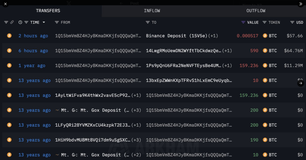 According to blockchain tracker Lookonchain, a cluster of addresses tied to coins pulled from Mt. Gox more than 13 years ago sent 300 BTC to Binance in a single transaction.