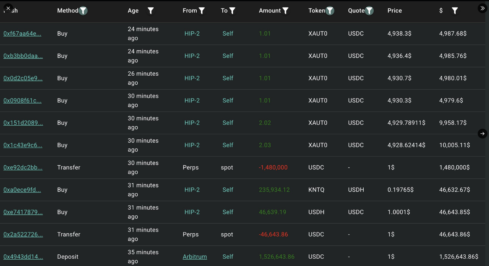 Según rastreadores en cadena, una dirección trasladó $1,53 millones en USDC a Hyperliquid para comprar XAUT. Los informes indican que la misma billetera había comprado anteriormente alrededor de 481 XAUT, una compra valorada en aproximadamente $2,38 millones.