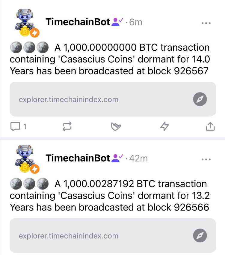 🚨🚨🚨 Dos monedas Casascius, cada una con 1.000 BTC, se acaban de mover después de haber estado inactivas durante más de 13 años. pic.twitter.com/nlFUy39MkD