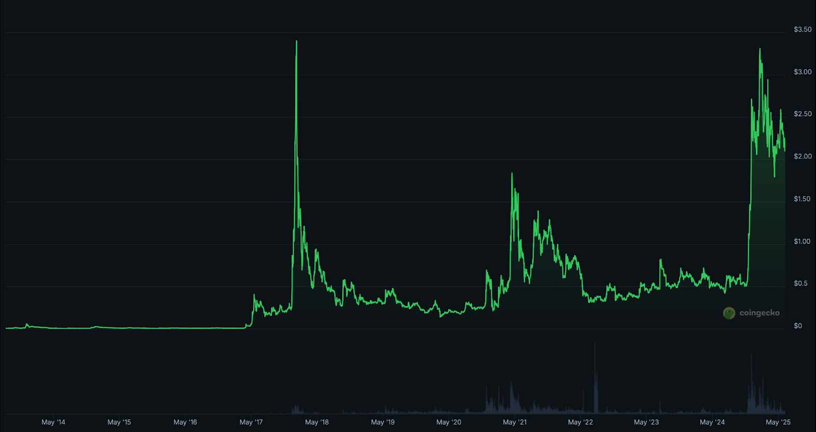 Después de caer en el olvido, el proyecto experimentó un resurgimiento inesperado de popularidad, lo que le hizo crecer más del 300% a finales de 2024, según CoinGecko. Con una capitalización de mercado de más de 128.000 millones de dólares, XRP se negocia actualmente a 2,18 dólares. A pesar de su ya elevada capitalización de mercado, el entusiasmo institucional por las criptomonedas podría impulsarlo a un nuevo ATH (máximo histórico).