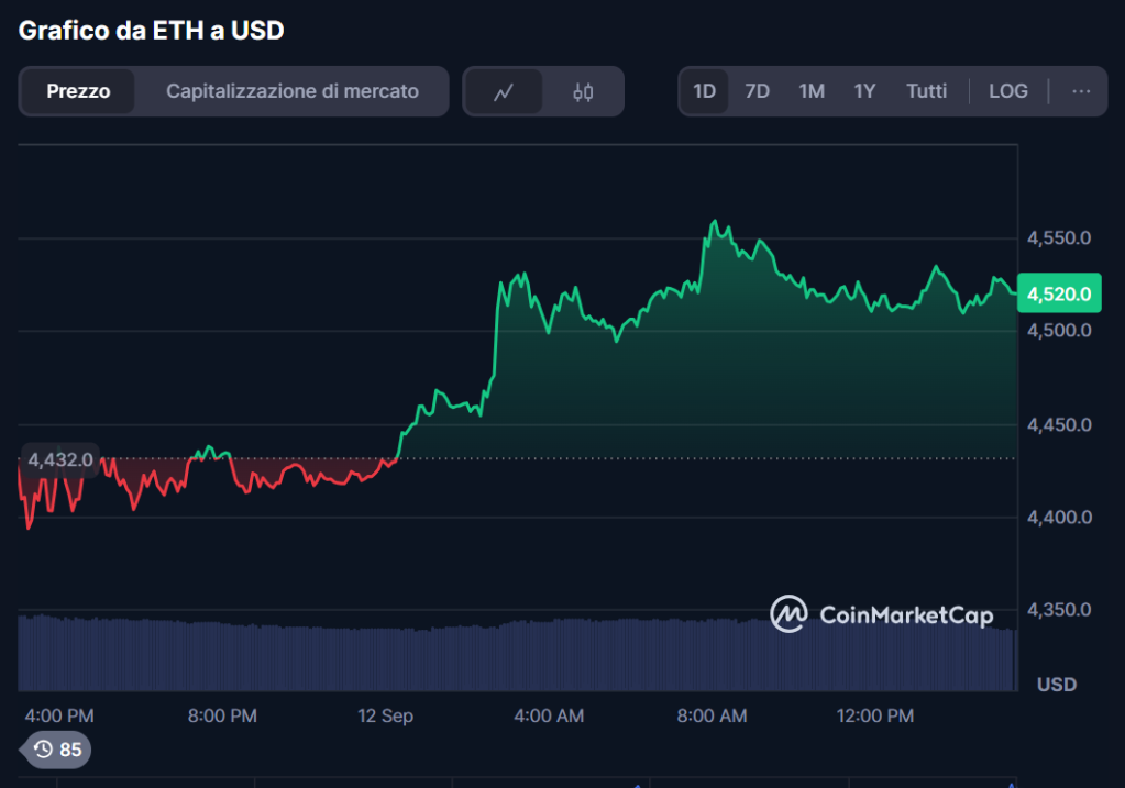 Al momento della scrittura, ETH è scambiato a $4.520, in crescita del 2,56% nelle ultime 24 ore.