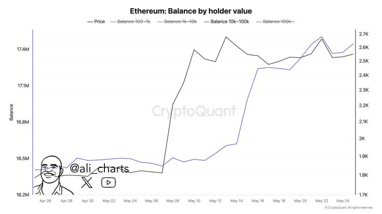 Mientras tanto, también llega una nota positiva: en el último mes Ethereum ha atraído nuevas compras por parte de las "ballenas", según lo informado por el analista Ali Martinez en un post en X.