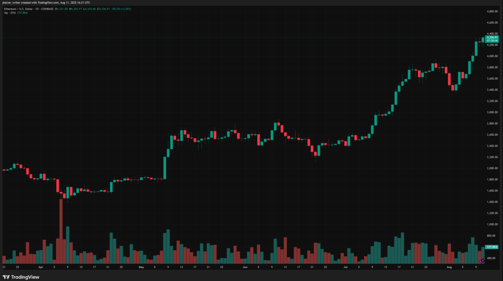 Ethereum (ETH) continúa su alza, superando los 4.300 dólares y registrando una ganancia impresionante del 45% en el último mes. La segunda criptomoneda más grande del mundo ahora apunta a la marca de los 5.000 dólares, impulsada por una acumulación récord por parte de las ballenas, flujos institucionales y una mayor claridad regulatoria en los Estados Unidos.