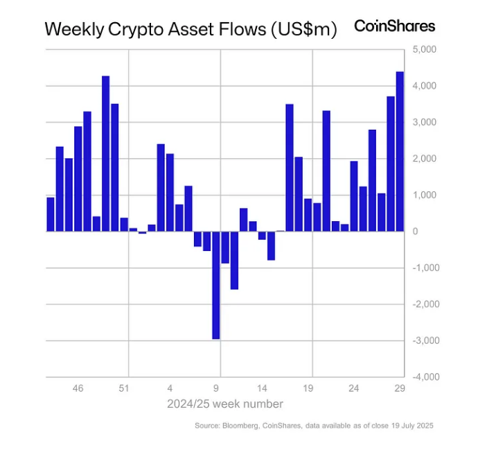 El mundo global de los fondos de criptomonedas experimentó otra semana excepcional mientras los inversores invertían masivamente. Según datos de CoinShares, las entradas netas en productos de activos digitales ascendieron a 4.400 millones de dólares, superando el récord anterior de 4.270 millones de dólares establecido después de las elecciones estadounidenses de 2024.