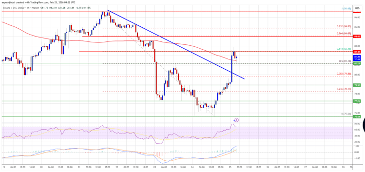 Sin embargo, los vendedores (los llamados "osos") están activos cerca de los 82,50 $ y el nivel de retracciamento de Fibonacci del 61,8% del movimiento descendente desde el máximo de oscilación de 86,68 $ al mínimo de 75,64 $. Solana se negocia ahora por encima de los 80 $ y la media móvil simple a 100 horas.