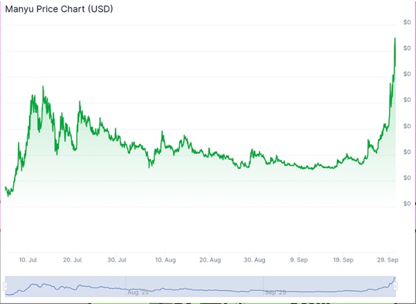 MANYU ha tenido un buen desempeño en el sector de las monedas meme recientemente, con un aumento del 308% en las últimas dos semanas, y un aumento del 45% en las últimas 24 horas.