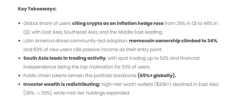 Los informes han revelado una clara tendencia en América Latina, donde la búsqueda de ingresos es alta. La propiedad de memecoins creció del 27% al 34% —el mayor aumento regional— y el 63% de los nuevos usuarios indicaron los ingresos pasivos como su principal razón para unirse a las criptomonedas.