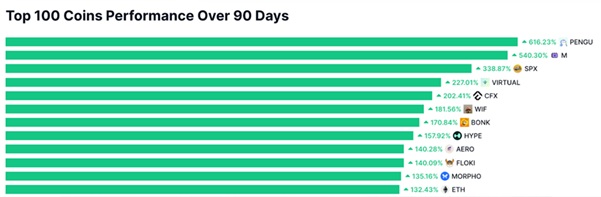 在過去90天內,PENGU(上漲656%)、MemeCore(534%) 和 SPX6900(338%) 領跑全市場。SPX 更是剛剛刷新歷史新高,暴沖至 $2.03,強勢突破前高!