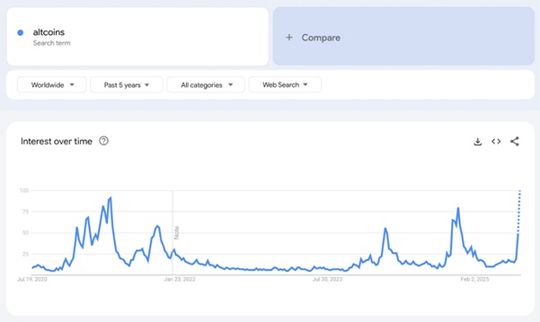 要衡量當前市場的 FOMO有多強烈,看看 Google Trends 就知道了。放眼全球,“山寨幣”這個關鍵字的搜索熱度正在飆升,有望突破過去五年的歷史高位!