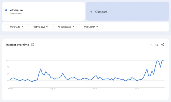 與此同時,從用於計算 CMC 山寨幣季指數 的 90天視圖週期 來看,全球範圍內“乙太坊”的搜索熱度也在加速飆升!.