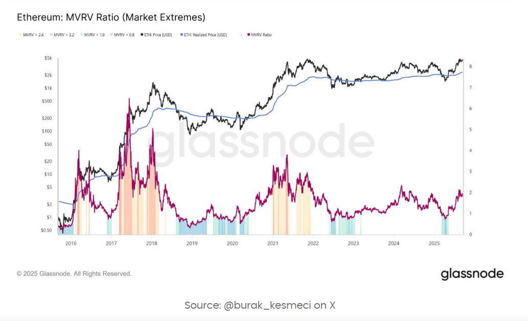 Utilizando datos de Glassnode, Kesmeci observó que la relación MVRV de Ethereum alcanzó los 1,97**, acercándose al umbral bajista históricamente significativo de 2,4**.