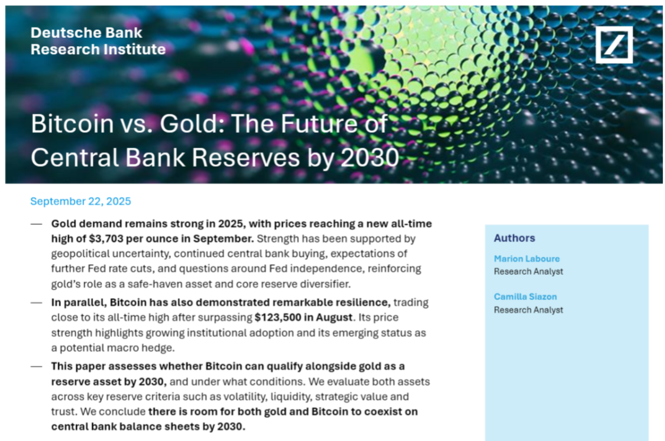 Según informes recientes, una investigación de Deutsche Bank predice que para 2030 habrá espacio para que **Bitcoin se una al oro en los balances de algunos bancos centrales**. El estudio afirma que ambos activos pueden actuar como cobertura contra ciertos riesgos y que la trayectoria que podría seguir Bitcoin refleja la lenta adopción del oro como reserva oficial.