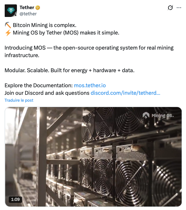 Con MiningOS, Tether busca reducir una barrera que durante mucho tiempo ha estado reservada para técnicos y grandes granjas, pilotar una actividad de minado de bitcoin. La empresa pone a disposición un sistema operativo dedicado, publicado como software libre, con el objetivo de facilitar la implementación, la supervisión y la automatización. Detrás del anuncio, una idea simple: devolver el control a los operadores, desde particulares hasta industriales, limitando la dependencia de herramientas cerradas y servicios centralizados.