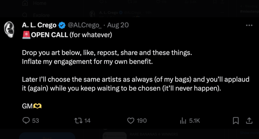Esto queda claro al ver que las piezas seleccionadas sobre mi pieza, que trata sobre la censura, tenían objetivamente mucho menos sustancia o visión. Más sobre esto un poco más adelante, pero al menos verás que lo justifica mi punto de que están sucediendo juegos de sombras más allá del mérito y la sustancia dentro del mundo del arte web3, al igual que en el arte legado también.