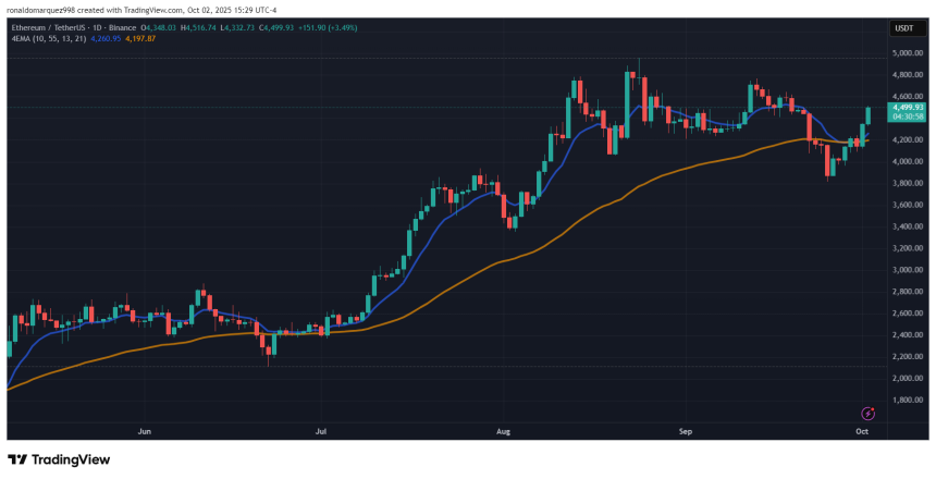 Il prezzo di Ethereum ha nuovamente superato la soglia dei $4.500, scambiando appena il 9% sotto il suo massimo storico di $4.946, spingendo a una serie di previsioni rialziste per la principale altcoin.