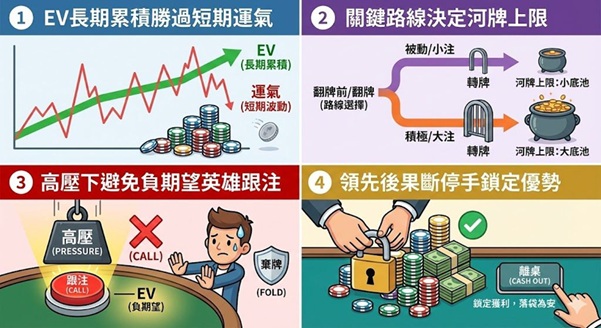 在CGWC這類長時間、高密度對抗環境中,技術決策必須服務於整體EV曲線,而非短期籌碼波動。成功的選手往往能在合適時點放慢節奏,避免因情緒或排名焦慮而偏離原有策略。這種自律能力,與牌力判斷同樣屬於高階技術的一部分。