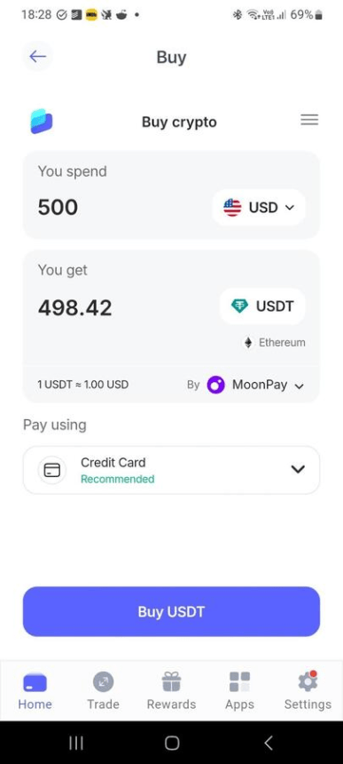 當你的錢包準備好後,前往「購買」區域以法幣購買加密貨幣。這將是你用來購買 $PEPENODE 代幣的加密貨幣,因此它必須是該專案支援的幣種。支援的加密貨幣包括以太幣(Ethereum, ETH)、泰達幣(Tether, USDT)、USD Coin(USDC)以及幣安幣(Binance Coin, BNB)。