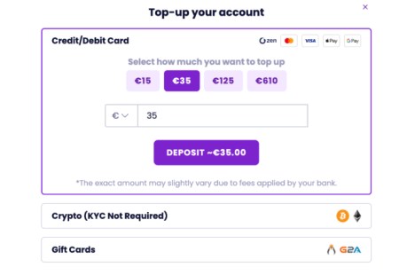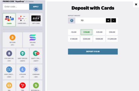 To fill up your account with funds, you can use a debit credit /card, gift card, or 13 different types of crypto.