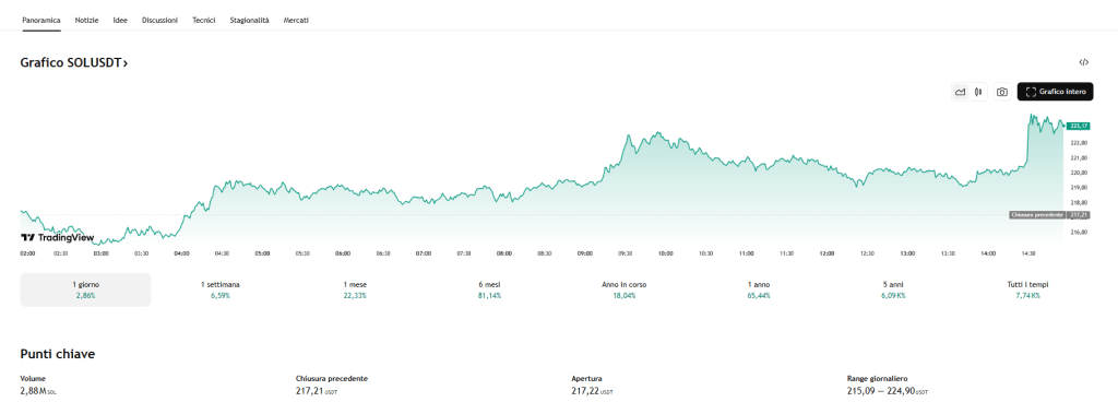 Solana mostra forte slancio, al momento della stesura dell’articolo SOL è scambiato a 222$ . Il grafico evidenzia che SOL sta testando una zona di resistenza critica non vista dall’inizio del 2025, segnando i livelli più alti degli ultimi mesi. Questa ripresa segue un trend crescente dai minimi di maggio vicino a 140$, supportato da minimi crescenti e pressione d’acquisto costante.