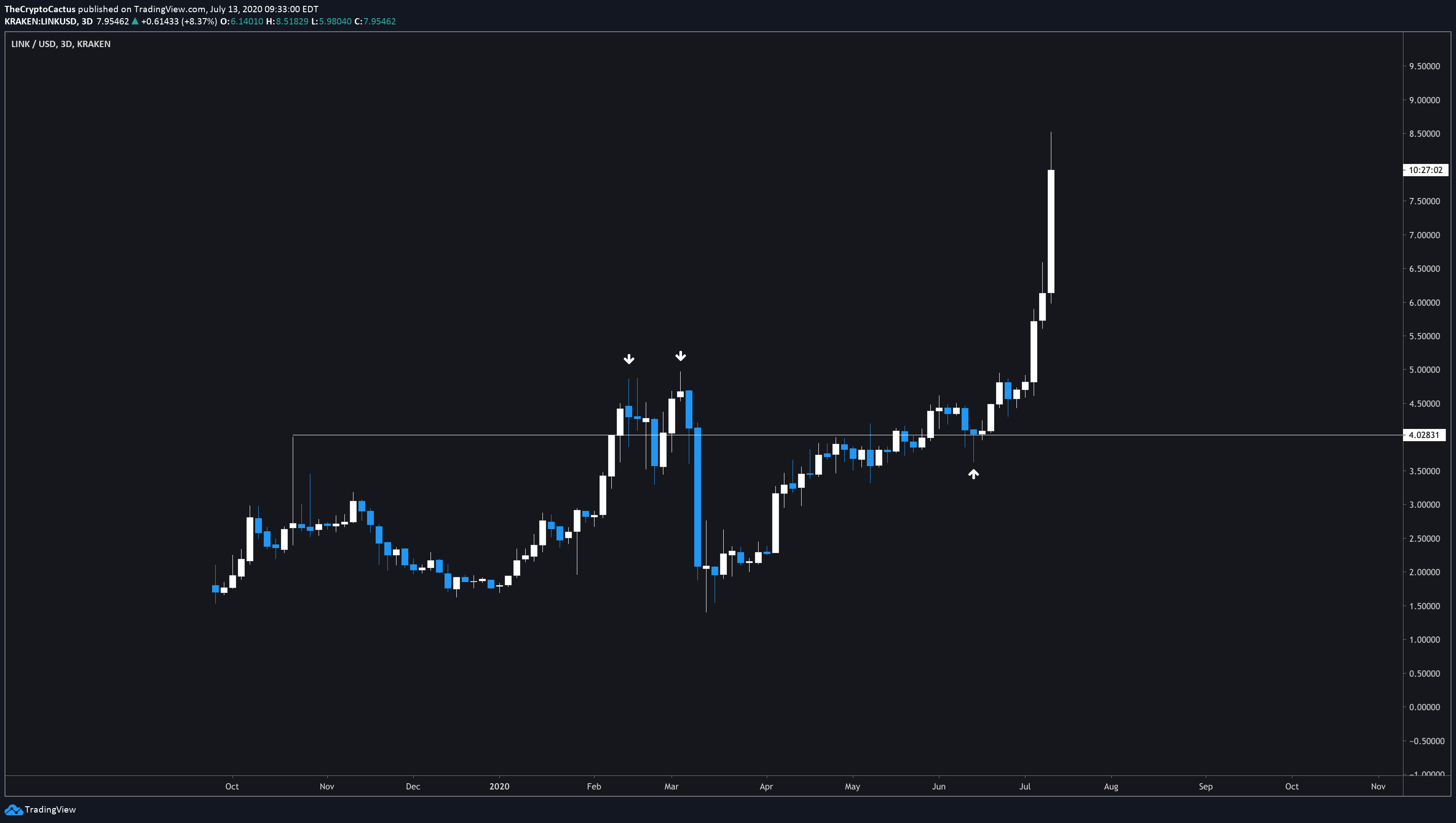 “LINK HTF Update: Pretty much perfect retest of $4 which was what I was originally looking for over the past 2 months… Currently up over 100% in the past month, probably going to be aiming for $10 this year,” he said.