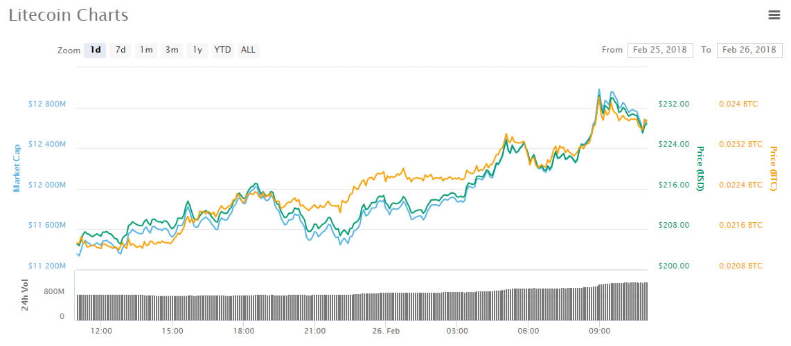 Coinmarketcap has LTC up 11% on the day during the morning’s Asian trading session. This time 24 hours ago it was trading at $205 and this morning it is up to $230. Litecoin peaked at $252 on Feb 21 but has fallen back by 20% over the week, today however it has rallied upwards once again. LTC is higher month on month and has remained above the crucial $200 support level for most of the latter half of February.