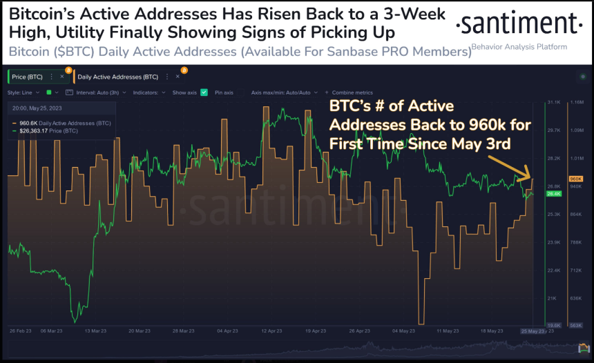 Bitcoin’s utility is on the rise as the number of active addresses for the cryptocurrency has surged to a remarkable three-week high, according to crypto intelligence portal Santiment in a Twitter update.