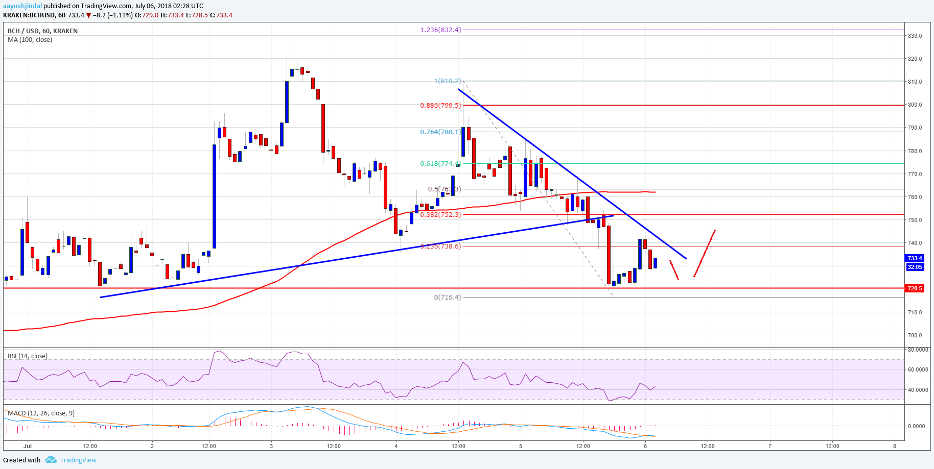During the decline, there was a break below a key bullish trend line with support at $748 on the hourly chart of the BCH/USD pair. The pair traded close to the $720 support and is currently trading in a range. It recently tested the 23.6% Fib retracement level of the last drop from the $810 high to $716 low. However, there is a strong resistance forming near the $750 level. Moreover, a bearish trend line is in place with resistance at $750. Therefore, a break above $750 is needed for a recovery in BCH.