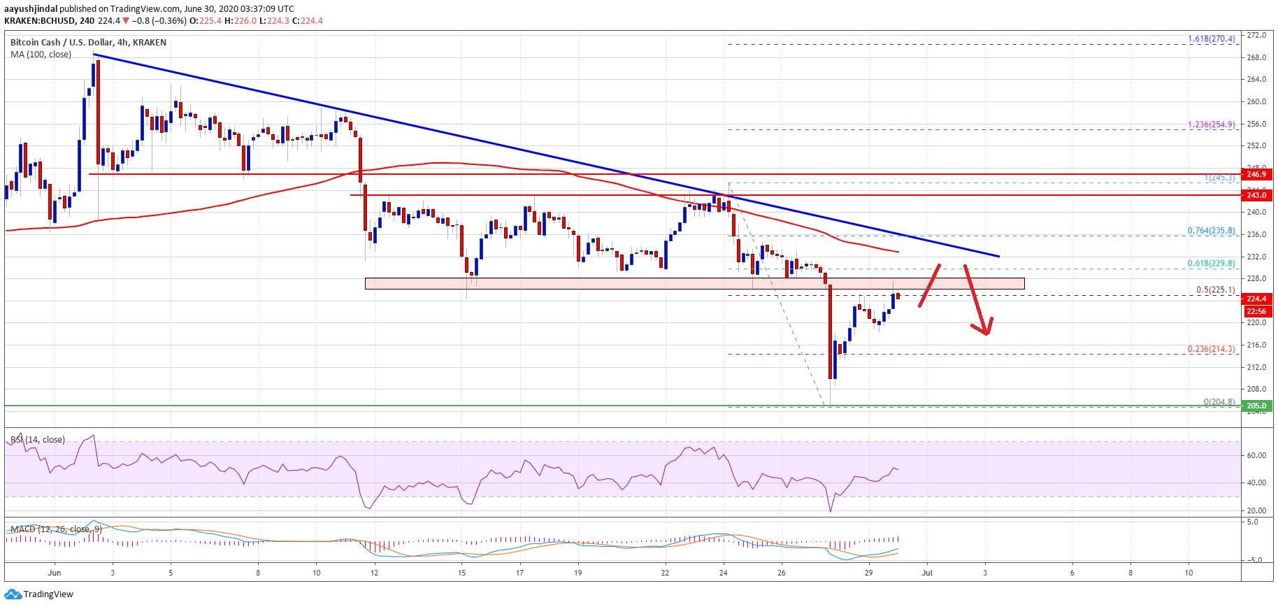 - There is a crucial bearish trend line forming with resistance near $230 on the 4-hours chart of the BCH/USD pair (data feed from Kraken).