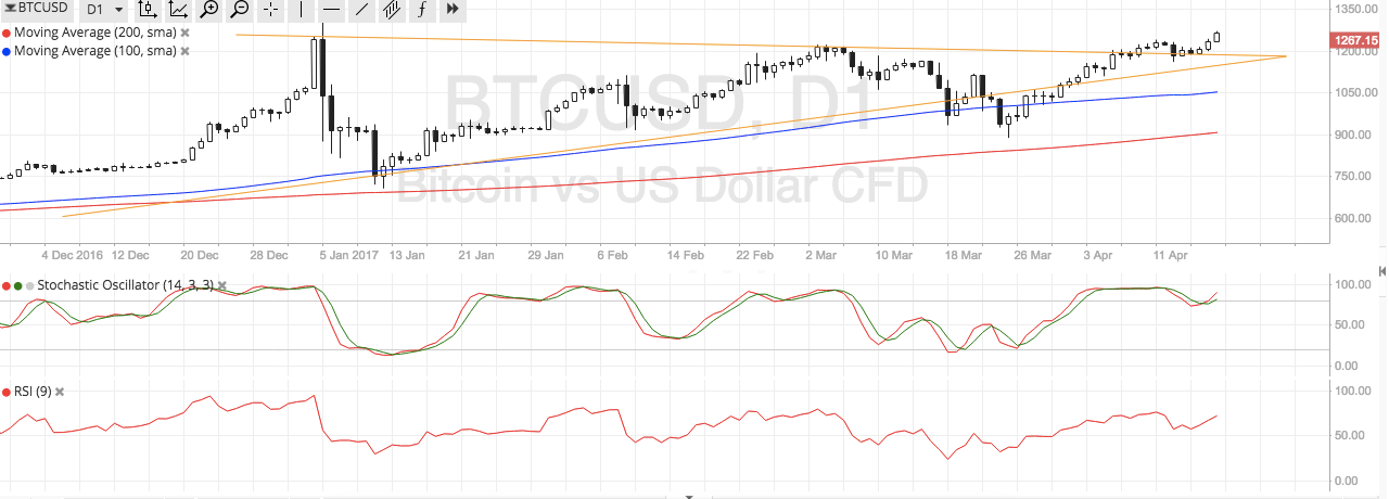 Stochastic is close to the overbought zone, which suggests that buying pressure could fade and that sellers might still take over. However, the oscillator seems to be turning higher again to show that bulls are putting up a strong fight. Meanwhile, RSI is still on the move up to indicate the presence of bullish momentum that could probably take bitcoin price up to the $1300 record highs.