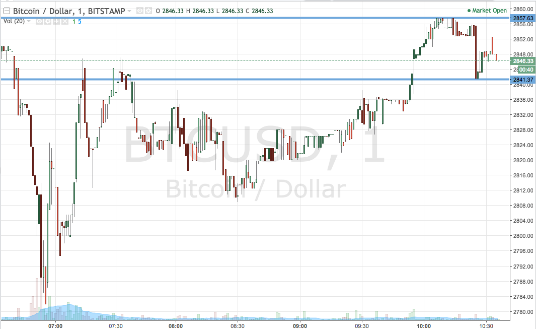 As the chart shows, then, our range for today comes in at support to the downside at 2841 and 2857. We’re looking to get in long on a close above resistance towards an upside target of 2870. A close below support, on the other hand, will have us in short towards 2825.