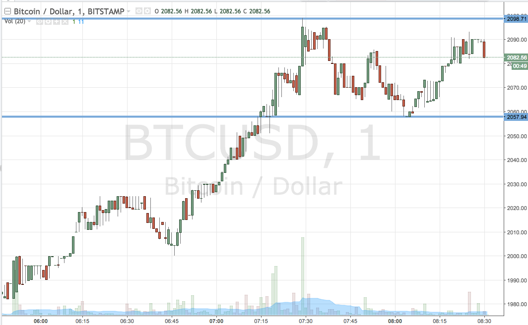 As the chart shows, the range we are focusing on for the session today is defined by support to the downside at 2057 and resistance to the upside at 2098. We will initially look for a close above resistance to validate an upside entry towards a target of 2130. A stop loss on this one somewhere in the region of 2088 will serve to get us out of the trade if and when price reverses, ensuring we aren’t caught on the wrong side of a losing position.