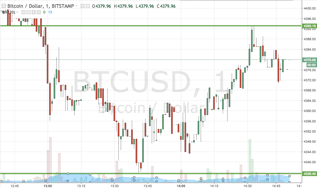 For the session this evening, we are going to widen out our range a little bit and incorporate both our breakout and our intrarange strategy into our operations. Things have been pretty volatile during the session today and the bitcoin price currently trades in and around the $4380 level. This is a strong recovery on the early week pricing and, with any luck, we will see a maintenance of the strength moving forward into the weekend. We cannot be sure, of course, but it looks as though the bulls are very much in control right now.