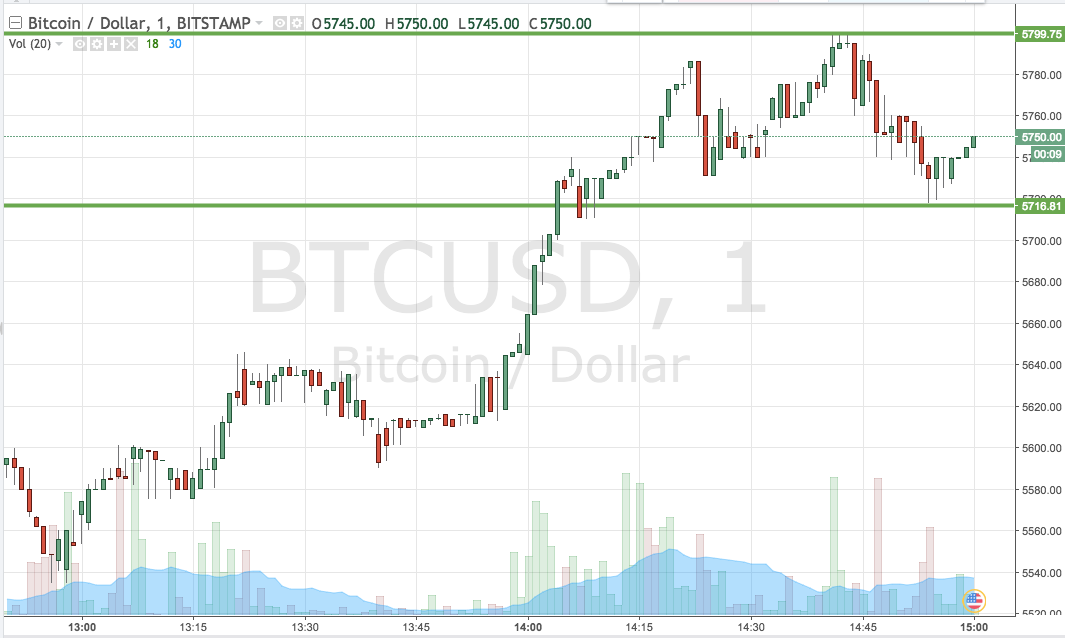 In this morning’s analysis, we noted that the bitcoin price had run up considerably over the last 24 hours and that there was a chance we may see some degree of correction near term. We are now heading into the close of the European session (and the close of the week) and, while we haven’t seen anything substantial in terms of corrective activity, we have seen price consolidate somewhat and settle down in and around the 5750 region.