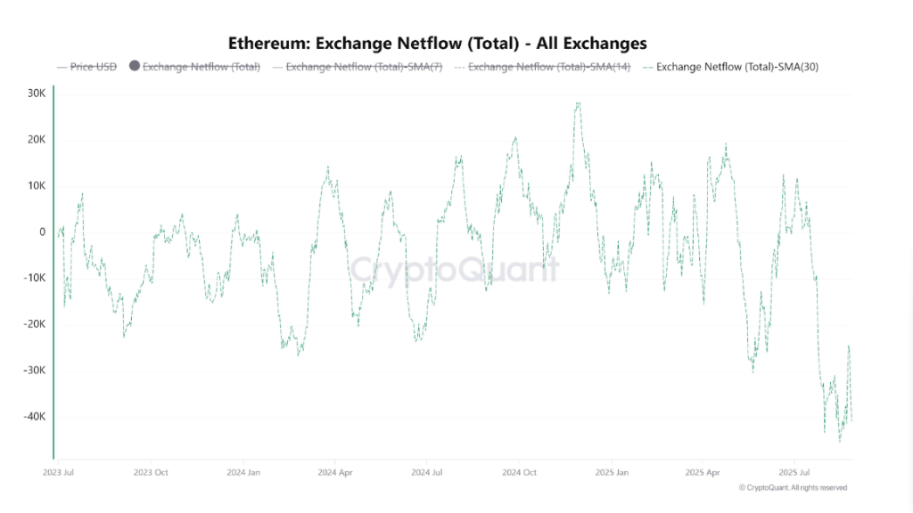 Data from a CryptoQuant Quicktake post by contributor CryptoOnchain adds further weight to this trend of heavy outflows. Between August and September 2025, Ethereum’s 50-day Simple Moving Average (SMA) netflow dropped below -40,000 ETH per day, the lowest level seen since February 2023. This persistent negative netflow shows that investors have been steadily shifting their ETH away from exchanges and placing it into staking, cold storage, or other long-term holding options. “Lower exchange balances equals reduced short-term supply,” the analyst said.