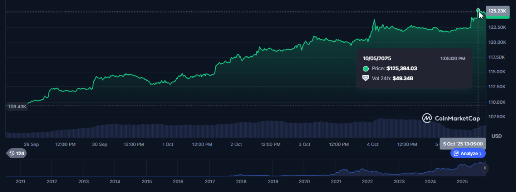 Bitcoin pushed to a fresh all-time high on Sunday, trading above $125,000 in Asian hours as markets extended gains into October. According to reports, the token rose about 2.7% to roughly $125,245 on the day, topping its prior August peak near $124,480.