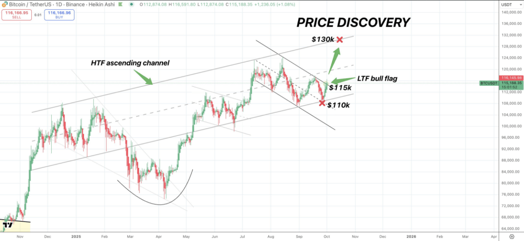 Analyst Satoshi Flipper pointed out that BTC appears to have built a base above the $115,000 area and is holding a higher time frame structure, adding that a long-term breakout aim sits near $130,000.