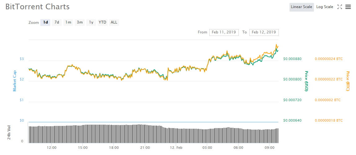 According to Coinmarketcap BTT has jumped 11% on the day in USD terms and 12% against Bitcoin. It is currently trading at 26 satoshis, 73% higher than what it was at inception. Binance has over 50% of the total trade but Upbit is currently the top fiat exchange with 35% of the daily volume as Koreans load up in KRW.