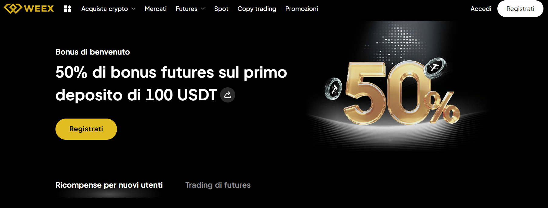 L’offerta di Weex: 50% di bonus sui primi 100 USDT