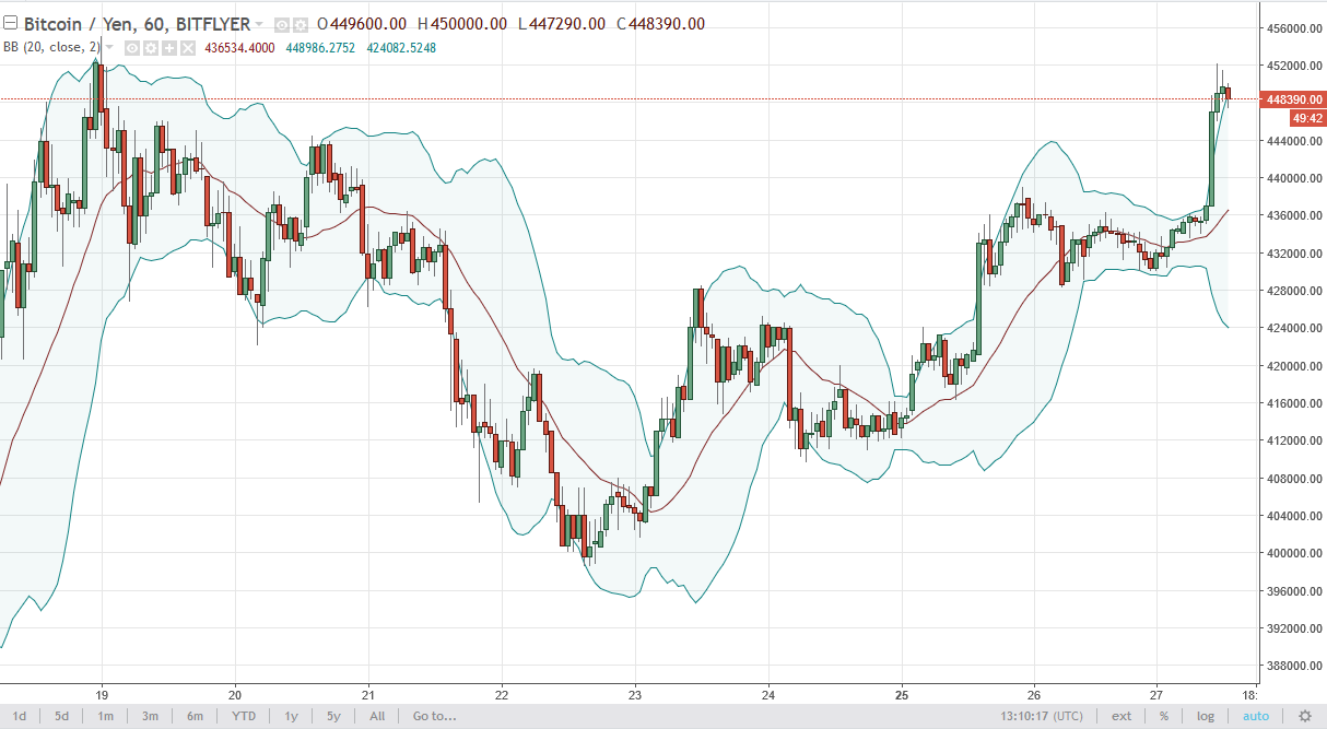 Bitcoin also rallied against the Japanese yen, testing the ¥450,000 level. We are starting to pull back a little bit later in the day, but I think that any pullback from here should be a buying opportunity, especially near the ¥440,000 level. Ultimately, I do think that we break out, and we go much higher.