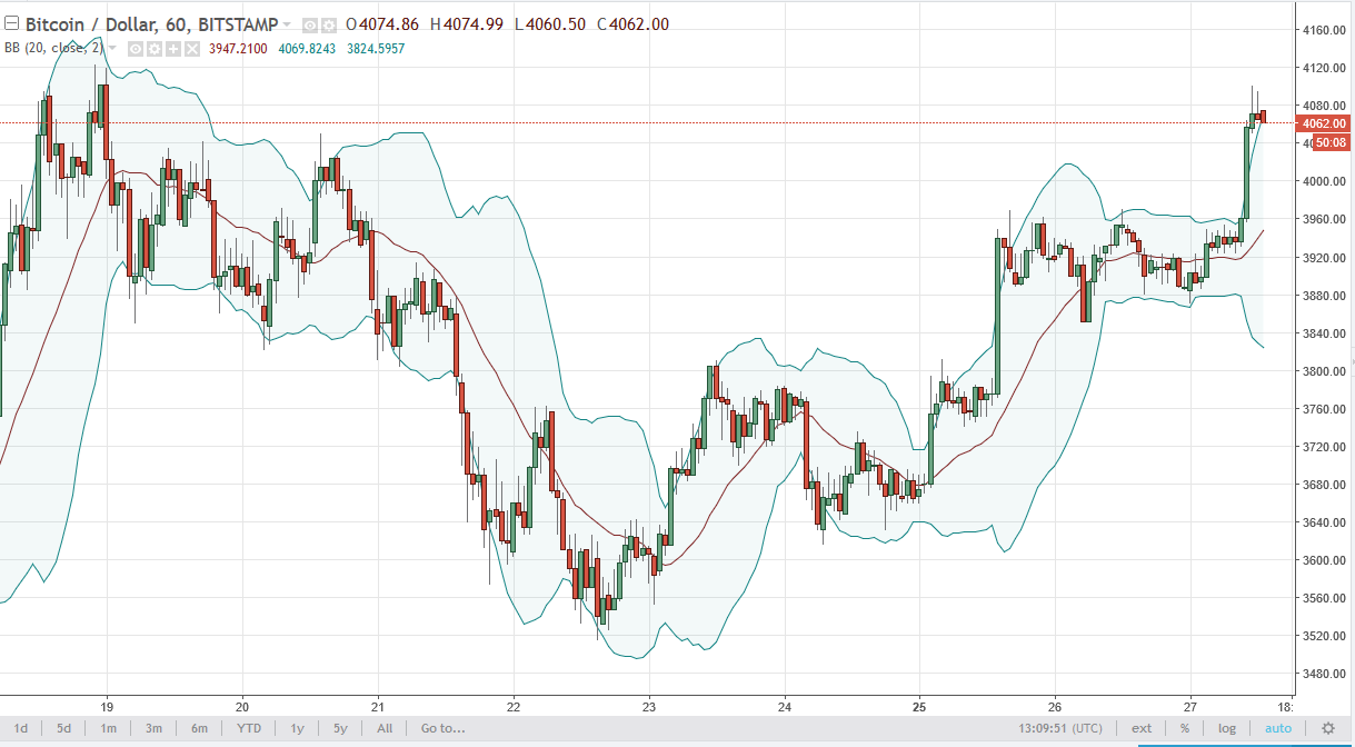 Bitcoin rallied again during the day on Wednesday, breaking cleanly above the $4000 level. I think that the market pulling back from here should be a buying opportunity though, and I think that a supportive candle is exactly what you’re looking for. I believe that the support runs down to at least the $3880 level. Ultimately, I think that the market should continue to look at Bitcoin as the leader of the crypto currency markets, and as it has rallied, the others have as well.