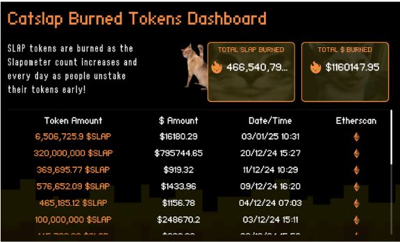 D’après les données du Catslap Burn Tracker, 466,5 millions de tokens, représentant une valeur de 1 160 147 $, ont déjà été brûlés, s’ajoutant au million de dollars initial et aux distributions du Slapdrop.