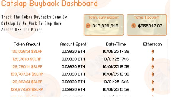 Dans le cadre de son engagement à soutenir la valeur des tokens $SLAP, l’équipe de Catslap a mis en place un programme de rachat stratégique. Ce programme a permis d’acquérir 347,8 millions de $SLAP sur le marché libre, pour une valeur totale de 855 047 $, consolidant ainsi la stabilité et la croissance du token.